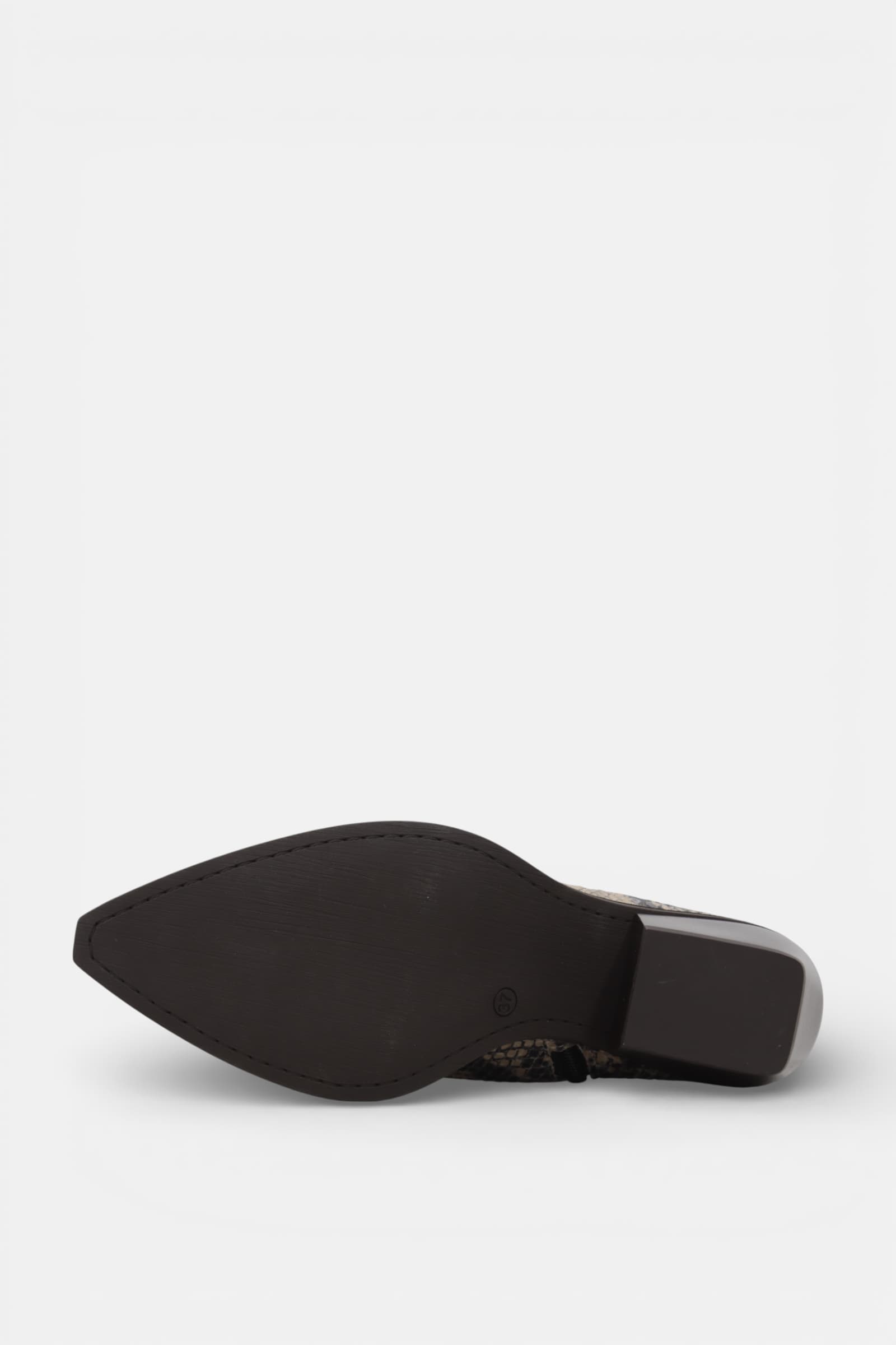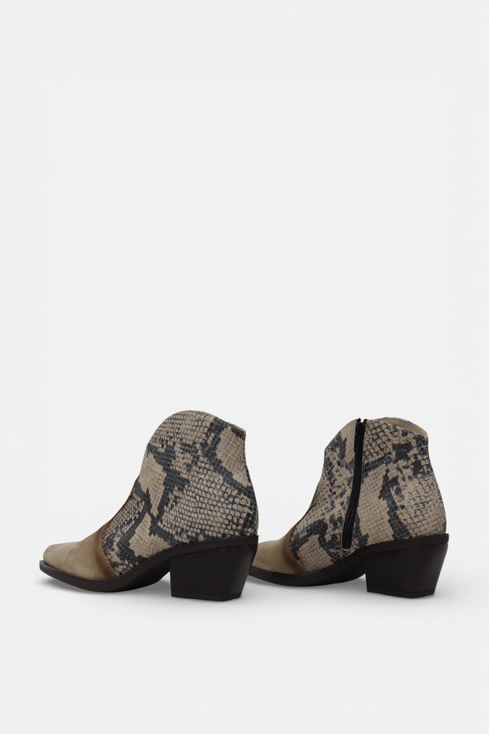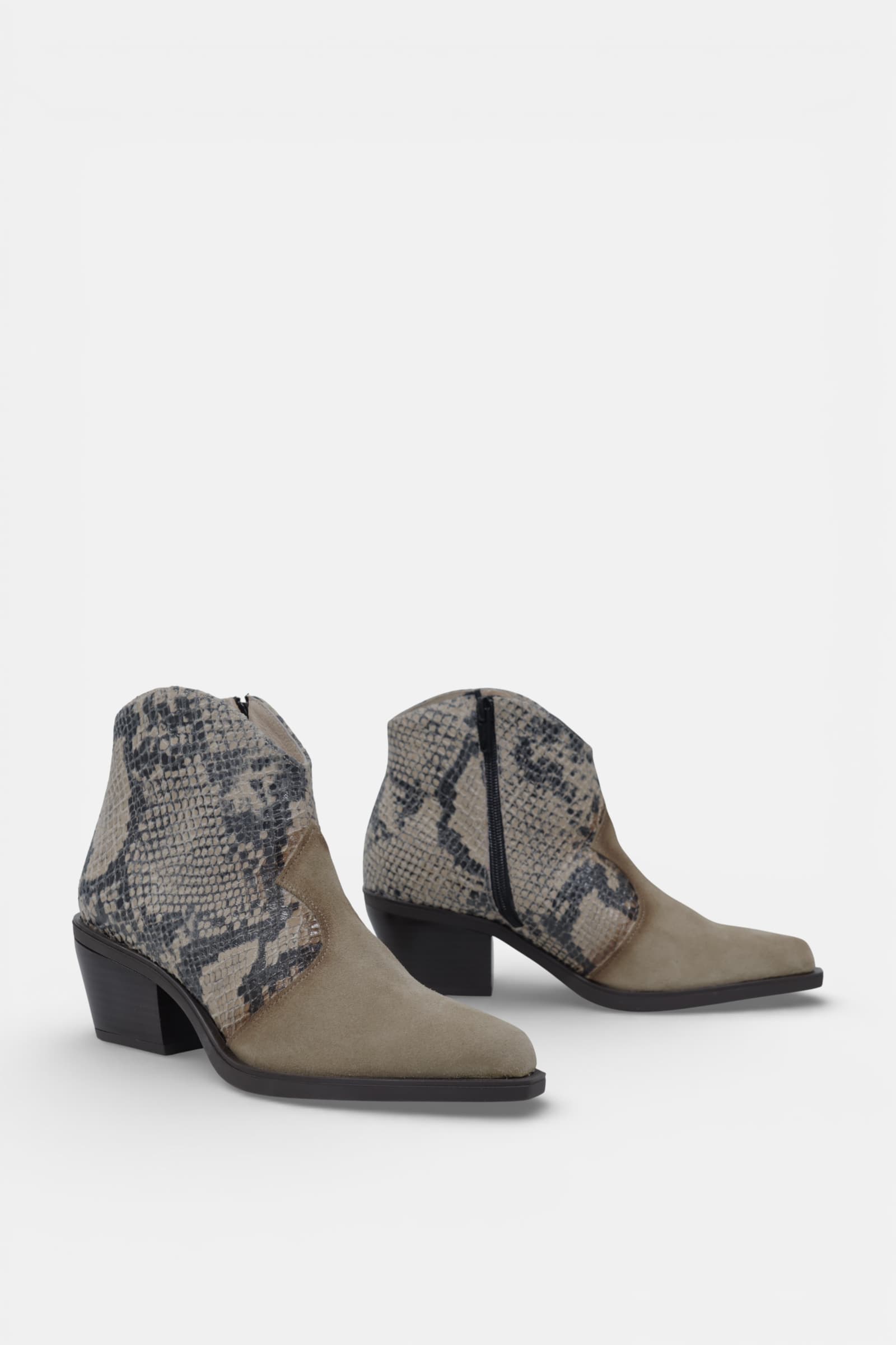 Explore o lado exótico da tendência western com esta bota texana de eleição. Numa sofisticada combinação de camurça tom taupe e aplicações em pele com padrão serpente, este modelo é uma verdadeira peça de afirmação. Os detalhes fumados conferem um acabamento artesanal único, enquanto o salto de 5cm e a sola antiderrapante asseguram o conforto necessário para o uso diário. Um design audaz, finalizado com um interior em pele para um ajuste perfeito.