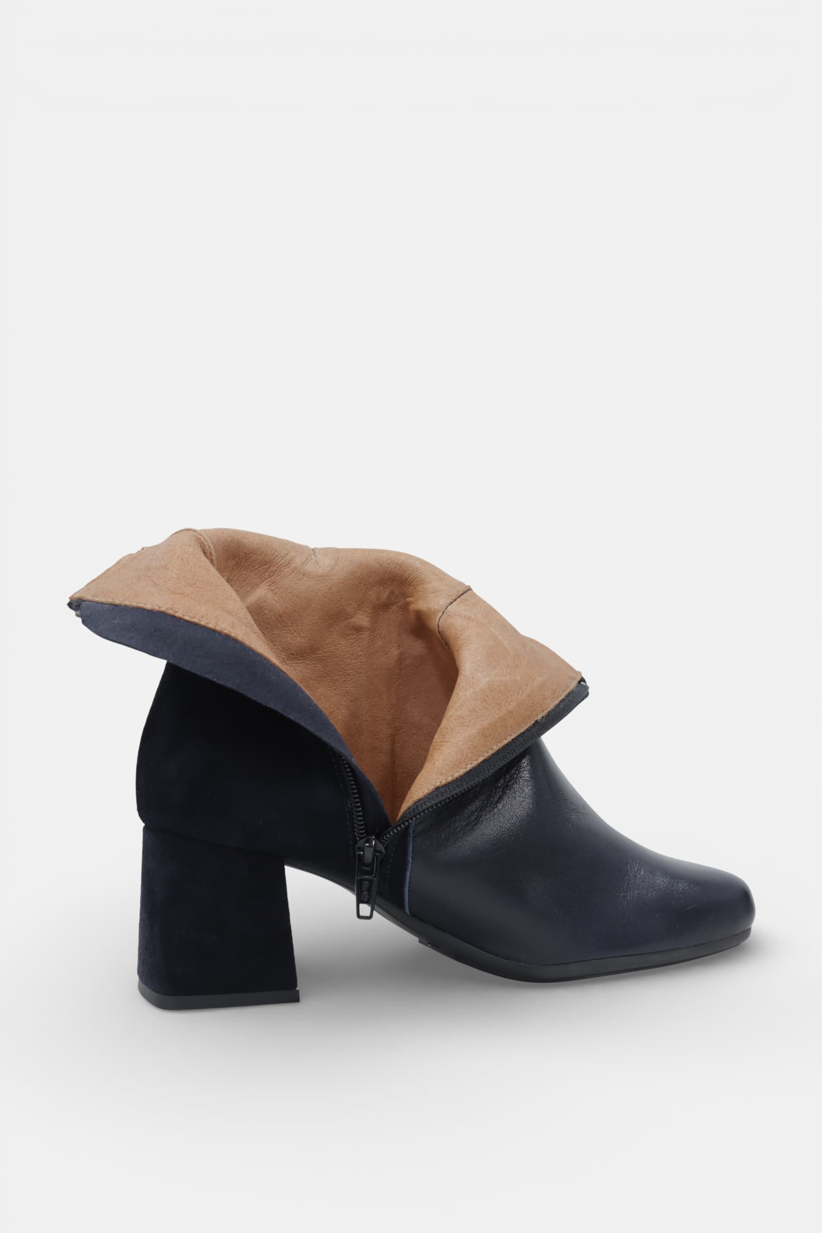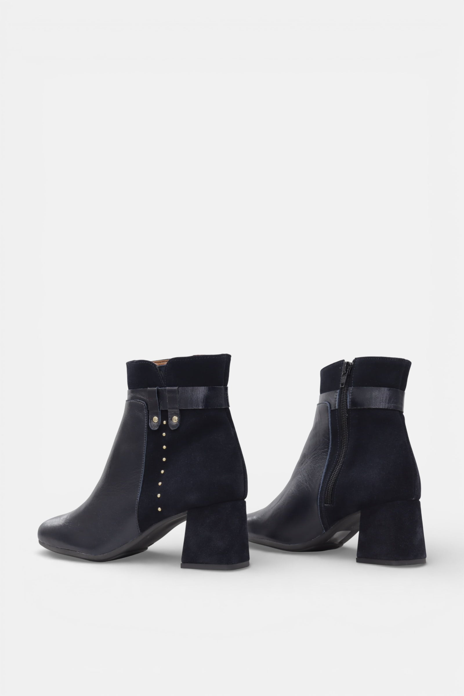 Clássica com um toque contemporâneo, esta bota em pele e camurça marinho destaca-se pelas tachas laterais que acrescentam personalidade ao visual. O salto estável proporciona elegância sem comprometer o conforto, tornando este modelo ideal para o dia a dia ou ocasiões mais formais. Um equilíbrio perfeito entre sofisticação e bem-estar.