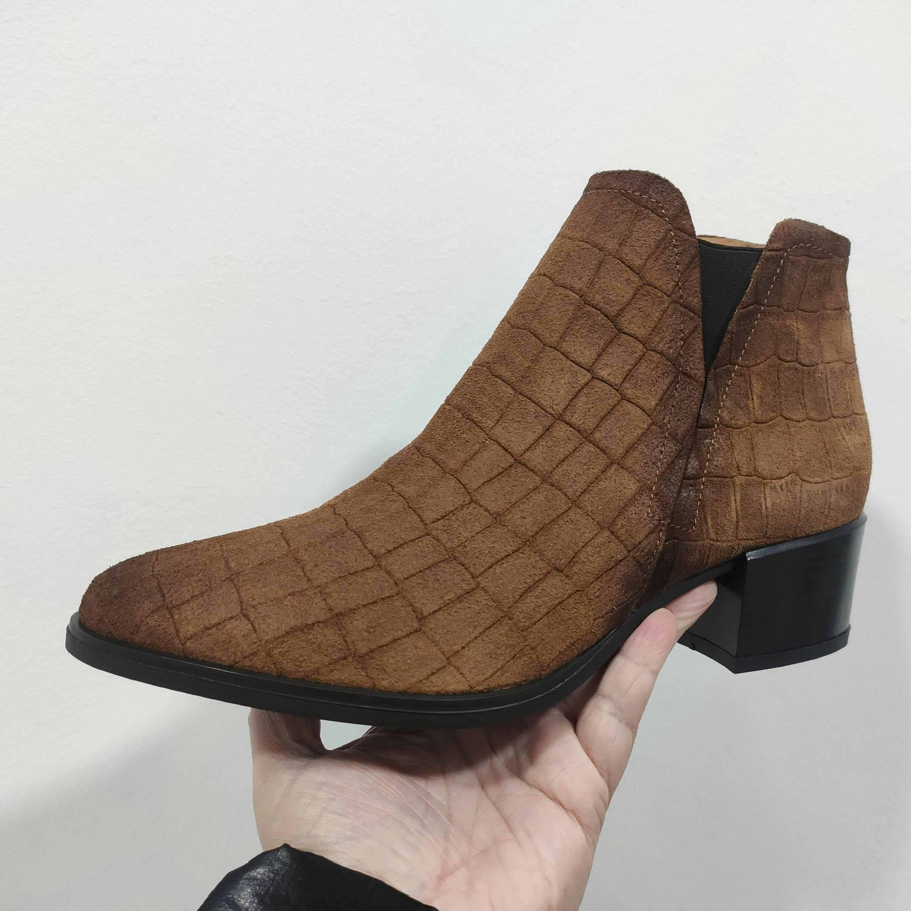 Descubra o equilíbrio perfeito entre elegância, conforto e qualidade com estas botas em camurça pele croco. Produzidas em Portugal, combinam o melhor do design contemporâneo com a tradição do fabrico nacional.