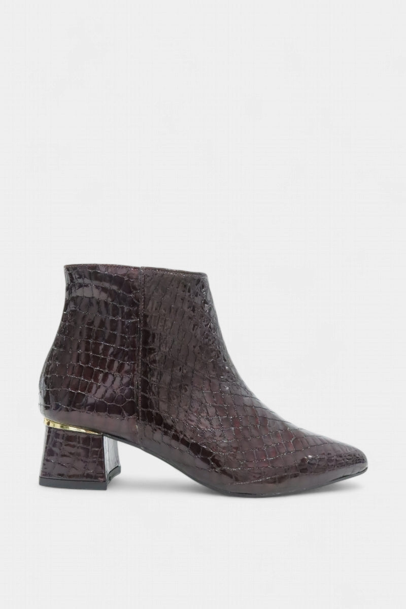 Eleve o seu guarda-roupa com a textura rica e o brilho profundo destes botins em pele envernizada com efeito croco. O tom bordô vibrante confere uma aura de sofisticação instantânea, tornando-os a peça central de qualquer look, do escritório a um jantar especial.