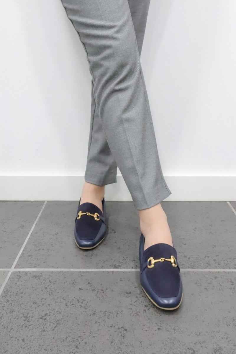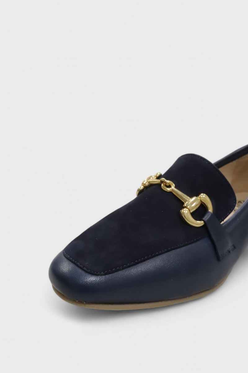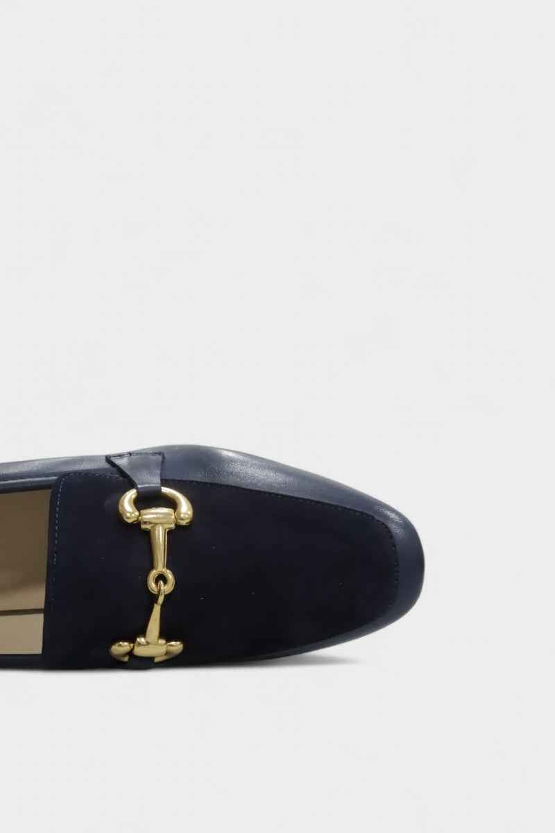 Sapatos mocassim de salto baixo em pele e camurça com detalhe metálico para mulher Daydoc Roma marinho