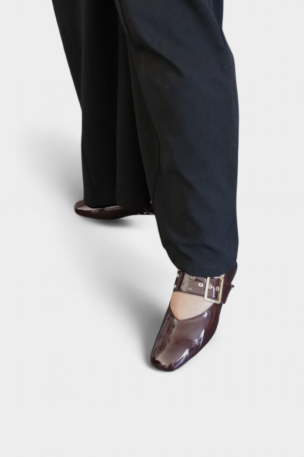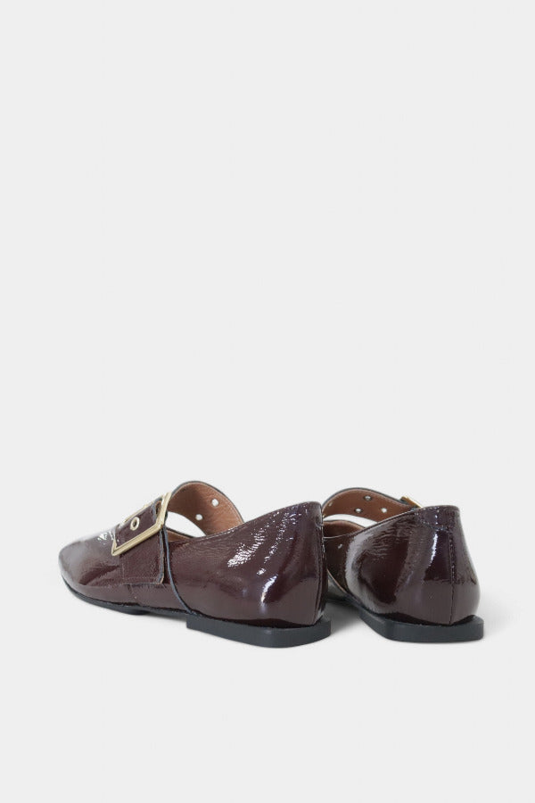 Este modelo apresenta uma silhueta Mary Jane refinada, marcada pela fivela larga que reforça o caráter elegante e funcional das sabrinas. A biqueira quadrada ligeiramente arredondada acrescenta modernidade ao design, enquanto o verniz bordô confere brilho subtil e sofisticação. Um estilo versátil, que se adapta tanto a looks formais como a conjuntos urbanos mais descontraídos.