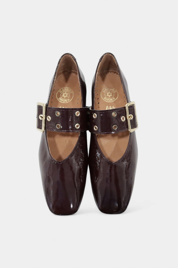 Sabrinas Mary Jane de salto baixo em pele envernizada para mulher Daydoc Bordéus bordô