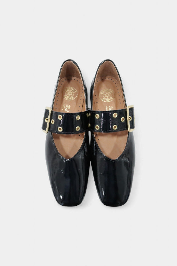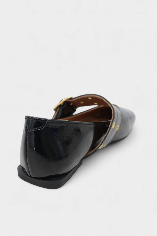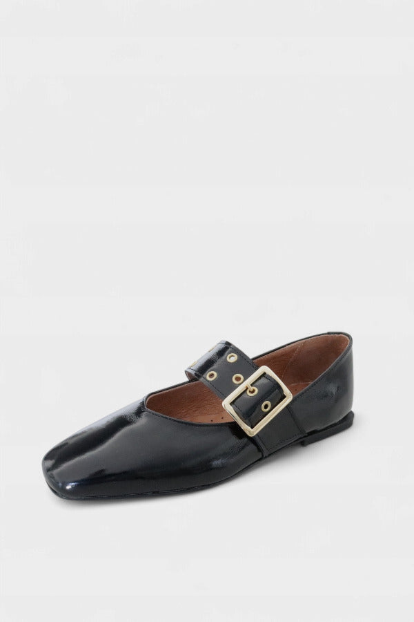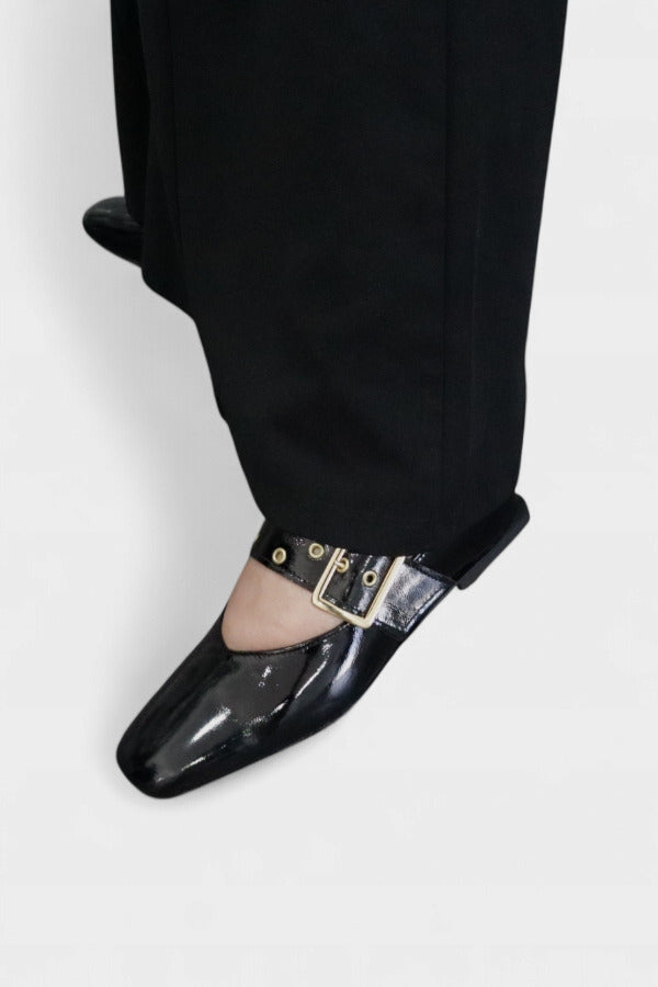 Estas sabrinas Mary Jane distinguem-se pela biqueira quadrada ligeiramente arredondada e pela fivela larga que reforça a identidade do modelo. O verniz preto acrescenta sofisticação instantânea, permitindo um equilíbrio perfeito entre moda e funcionalidade. A construção elegante adapta-se tanto a ambientes formais como a momentos descontraídos onde o detalhe faz diferença.