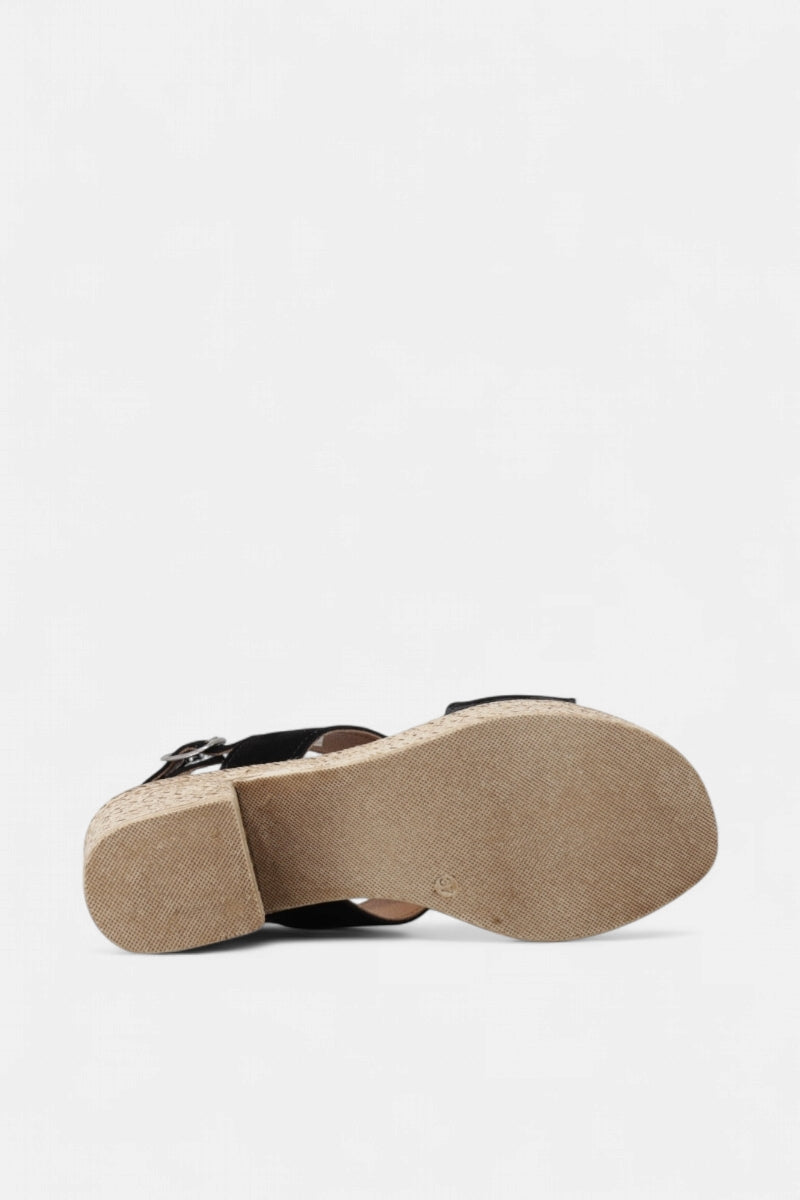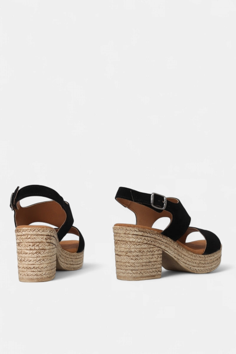 Sola: Imitação de corda, tacão grosso 8 cm, compensada 3 cm, com rasto borracha