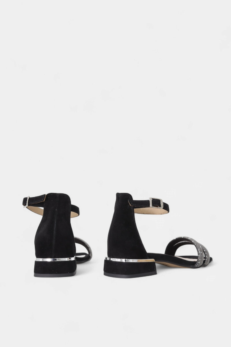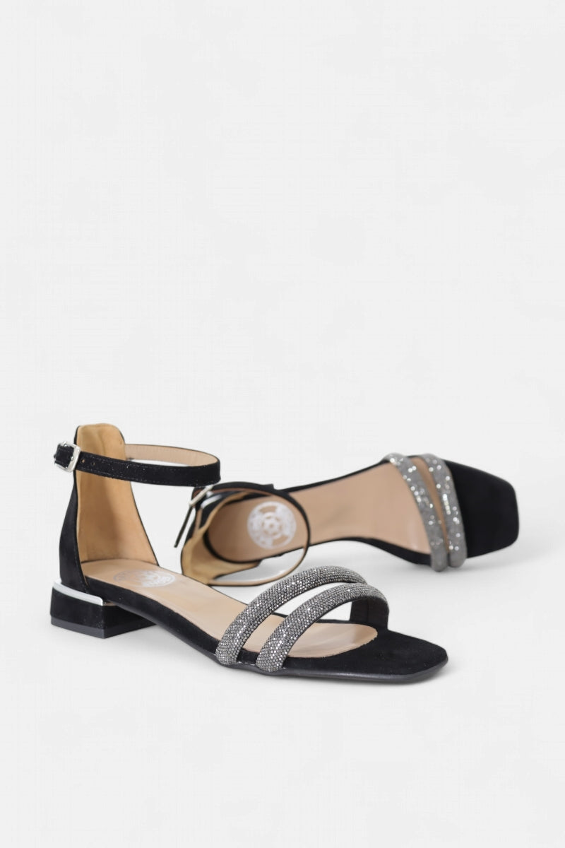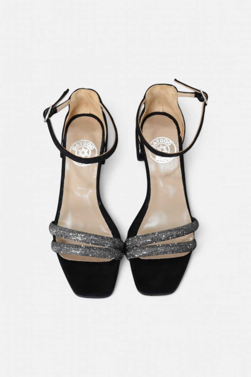 Sandália Clássica em camurça e tiras strass – Elegância, Estabilidade e Conforto com Brilho Discreto