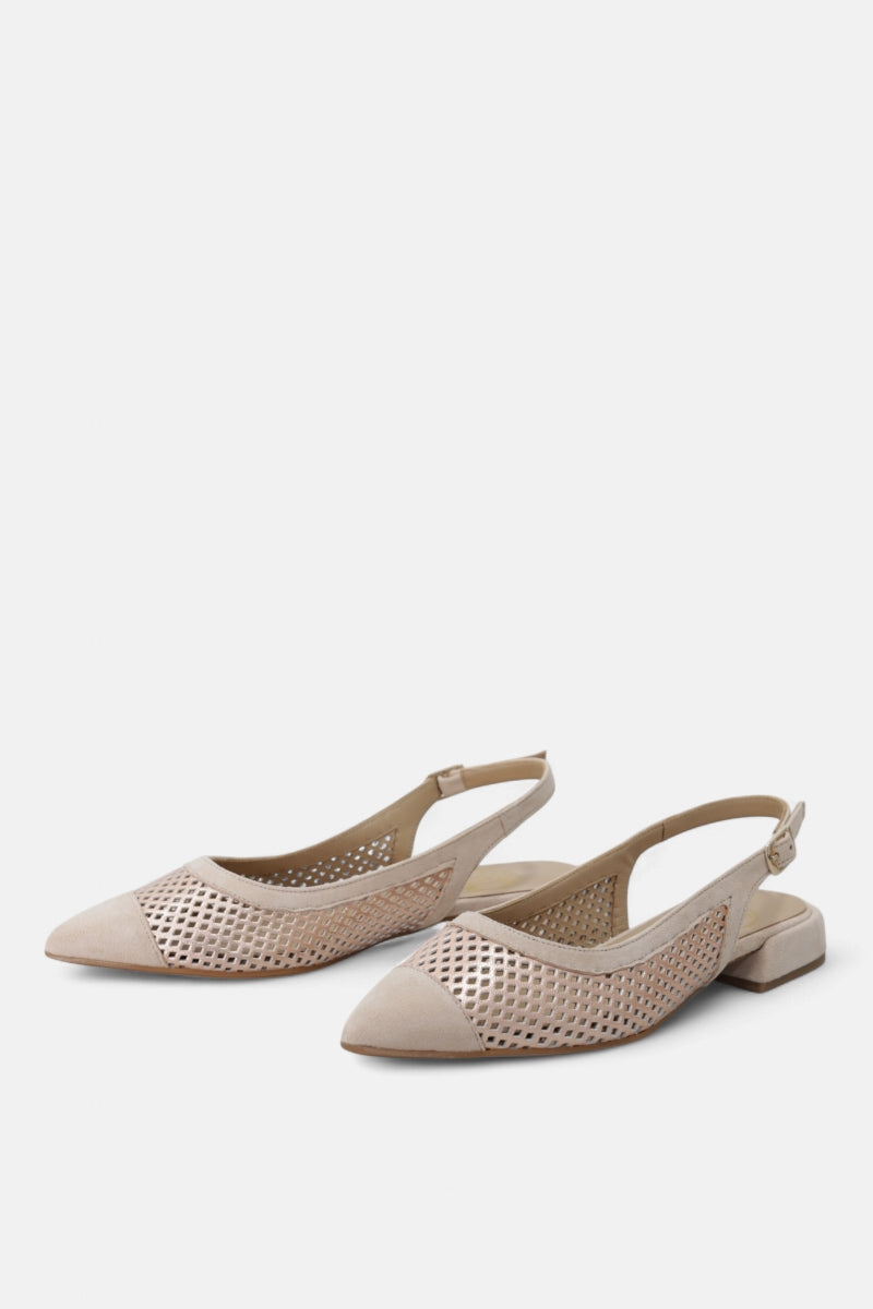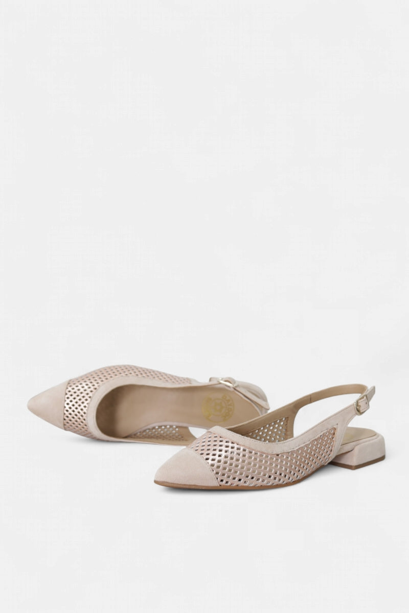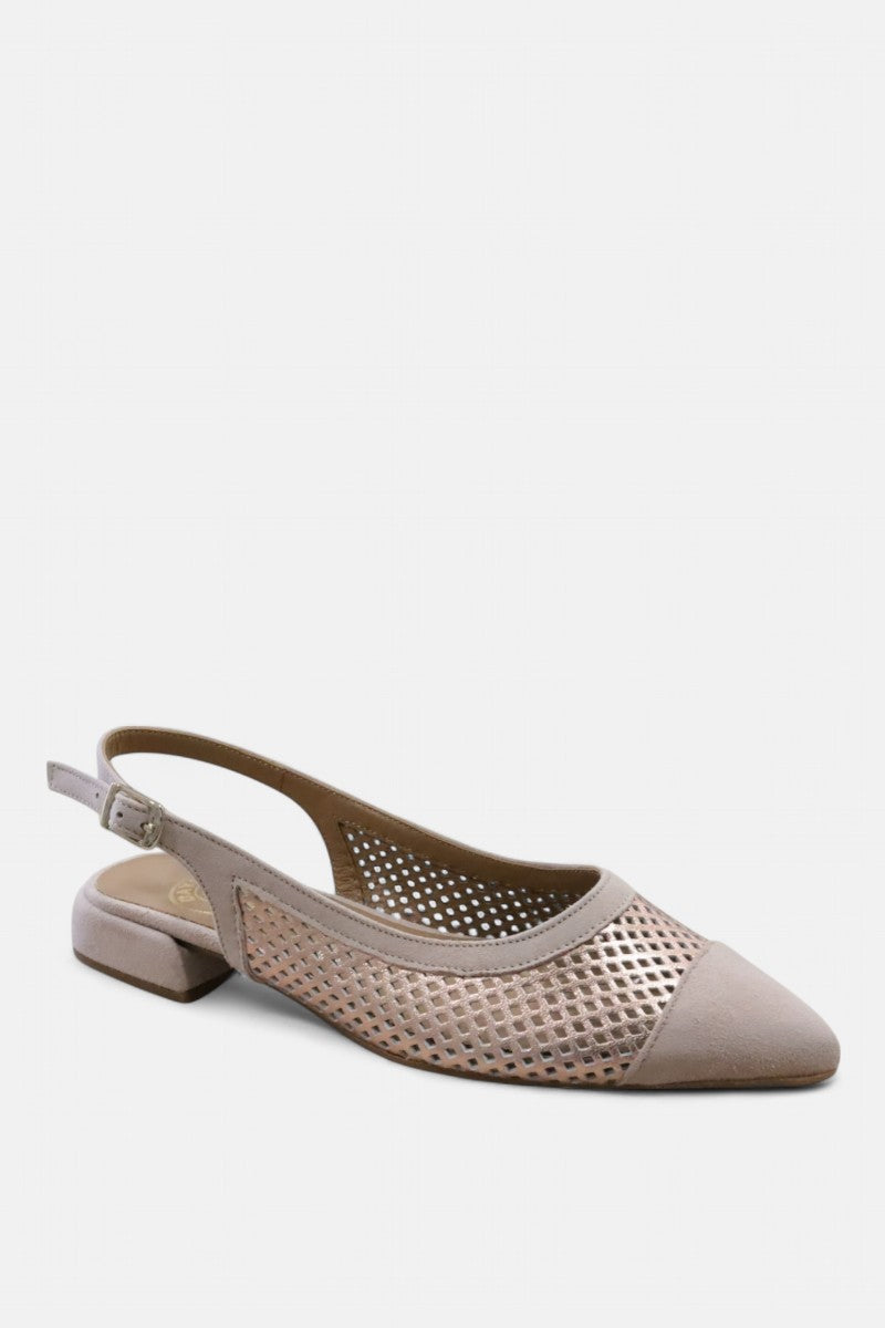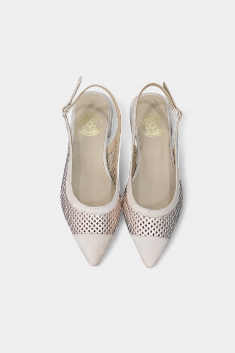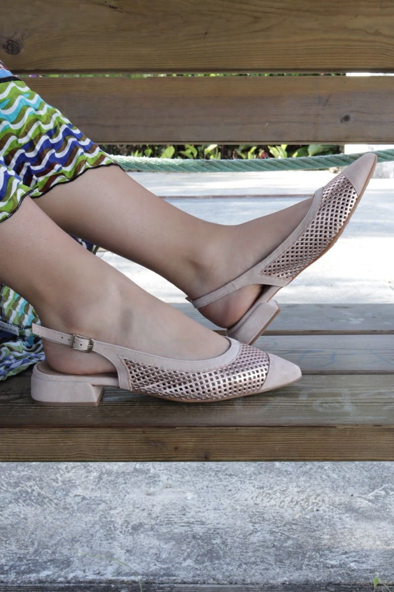 Estas magníficas sandálias de mulher, em forma bicuda, com salto baixo de 2 cm, em pele laminada vazada, que a fazem sentir ainda mais elegante, são fabricadas em PORTUGAL.