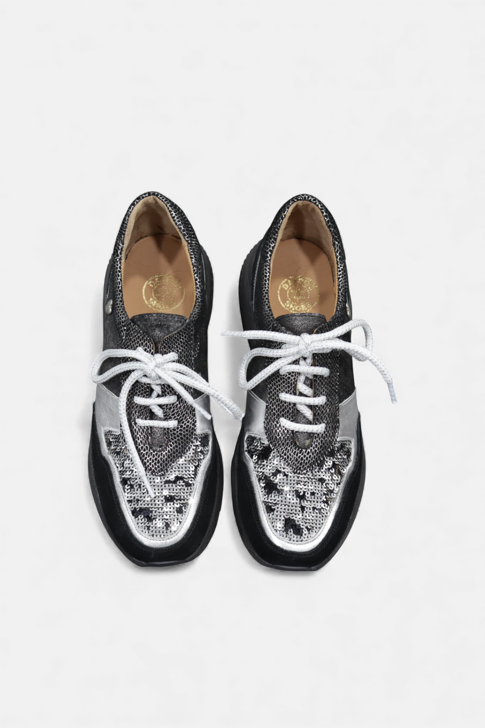 O modelo Lisboa apresenta uma fusão de camurça preta com pele laminada prateada, fantasia geométrica e lantejoulas discretas, criando um visual contemporâneo e cheio de personalidade. As linhas equilibradas e o atacador tradicional mantêm a estética casual, enquanto os apontamentos metalizados acrescentam elegância e dinamismo ao conjunto.