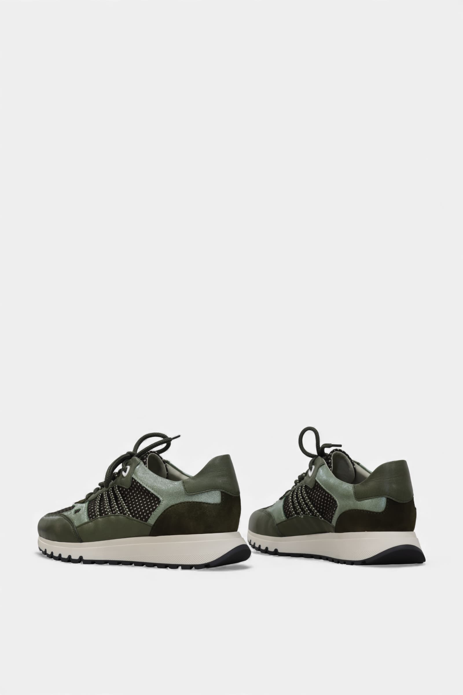 O modelo Mafra apresenta um estilo casual chic realçado pela mistura de pele macia, rede têxtil e detalhes em pele laminada. As diferentes texturas criam contraste e profundidade visual, enquanto o tom verde acrescenta personalidade ao look.