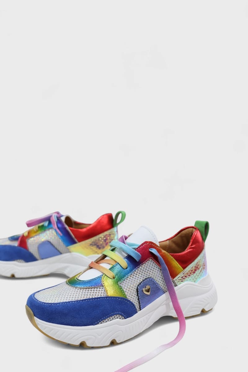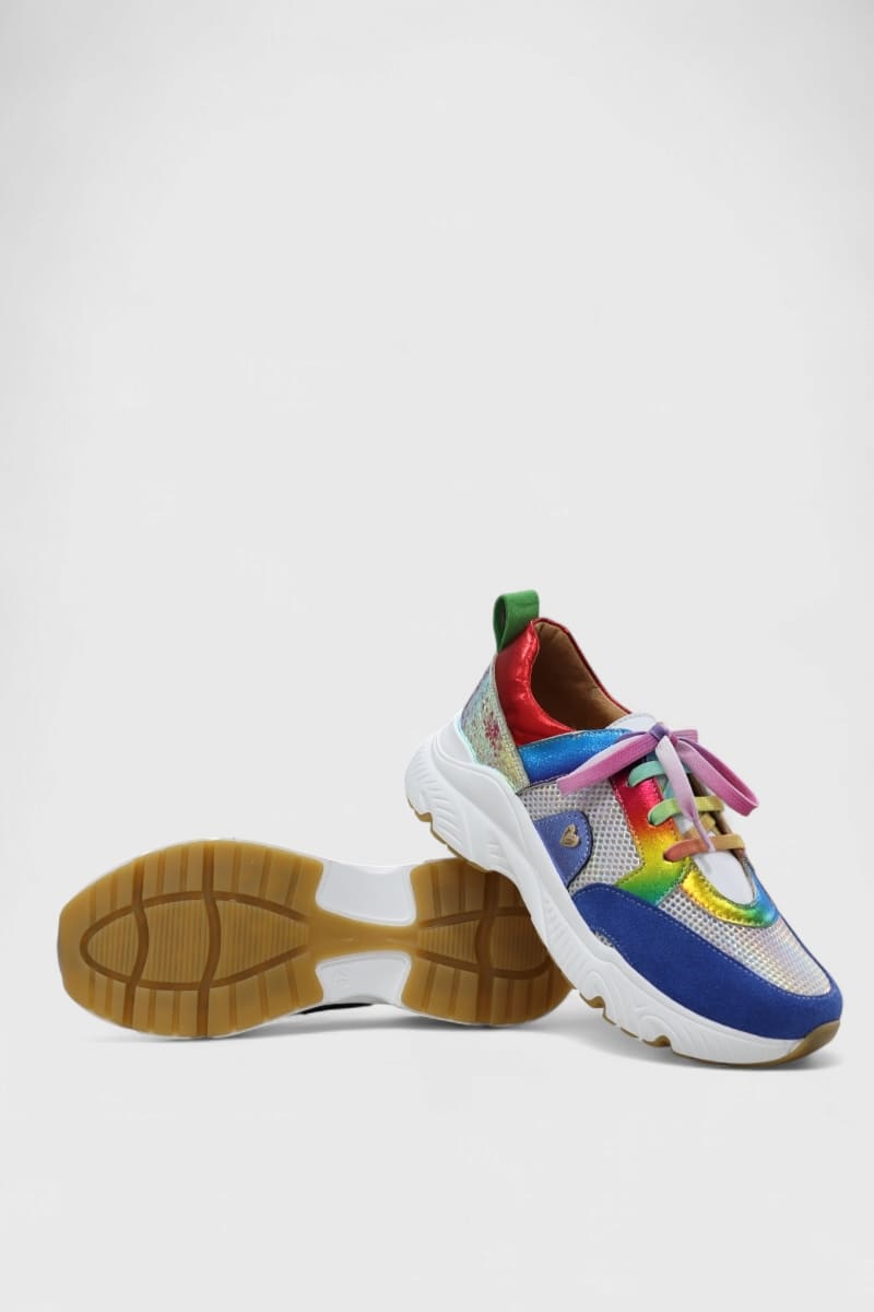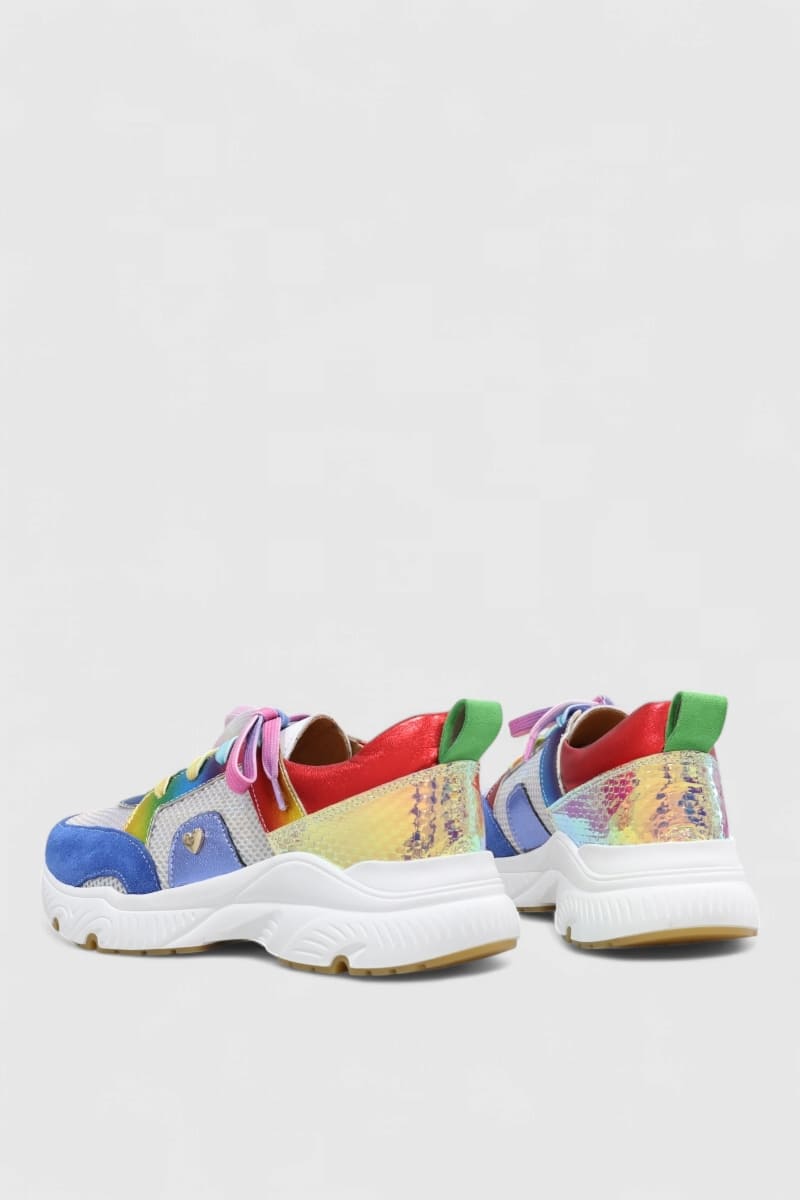 Seja o centro das atenções com os ténis BELÉM - ousados e cheios de personalidade! Confecionados em pele de alta qualidade, combinam materiais metalizados com efeito arco-íris e painéis em rede que garantem um visual fresco, moderno e transpirável. A sola grossa traz um toque urbano e atual, enquanto as palmilhas acolchoadas oferecem um conforto superior para o dia todo.