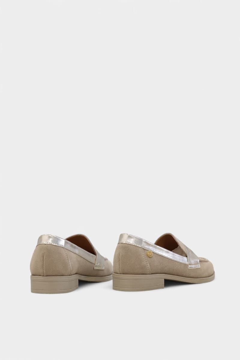 Com um perfil clássico e intemporal, estes sapatos mocassim apresentam linhas depuradas complementadas pela camurça natural e pelos apontamentos metalizados em dourado, que acrescentam luminosidade discreta ao conjunto. A cor bege reforça a versatilidade do modelo, permitindo combinações harmoniosas em ambientes profissionais ou em coordenados urbanos elegantes.