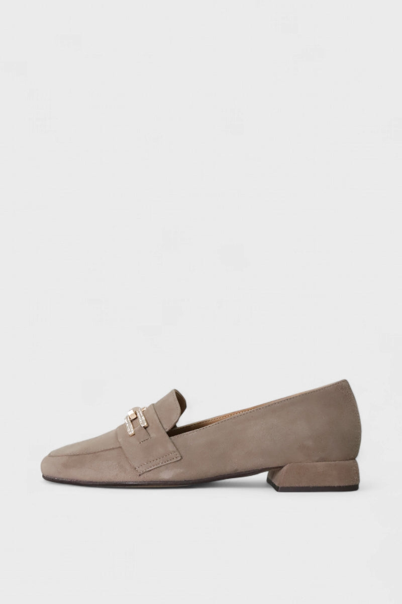 Modelo prático e elegante, em camurça, com aplicação metálica com brilhantes e com salto baixo sendo excelente para uso diário.