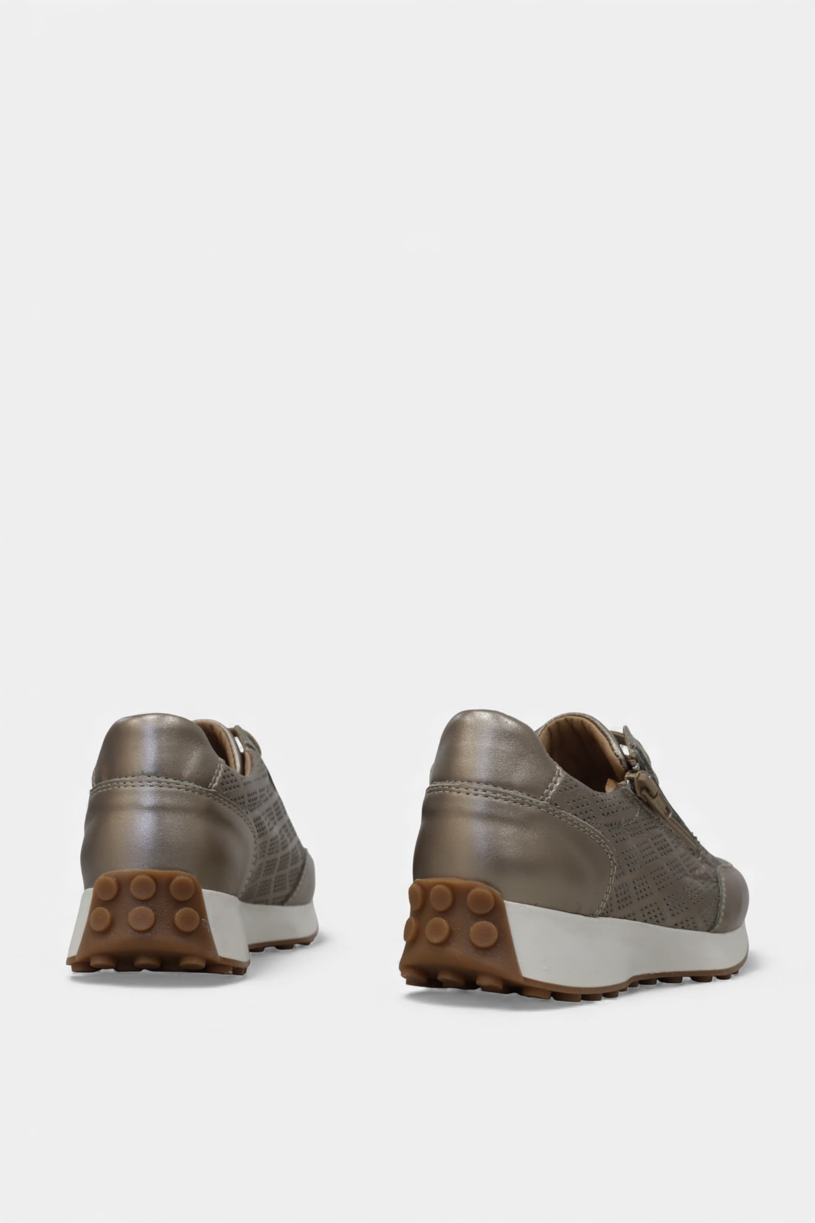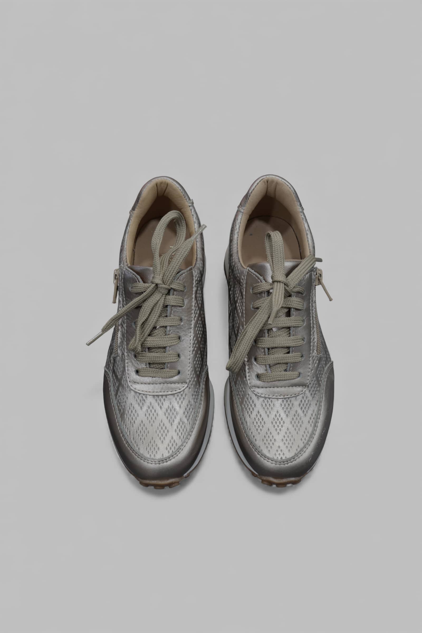 Estes ténis em pele natural metalizada lisa e gravada, modernos e práticos, que apertam com cordão e com fecho lateral para serem mais cómodos, são fabricados em Portugal. A sola moderna é resistente sendo ideal para o uso diário.
