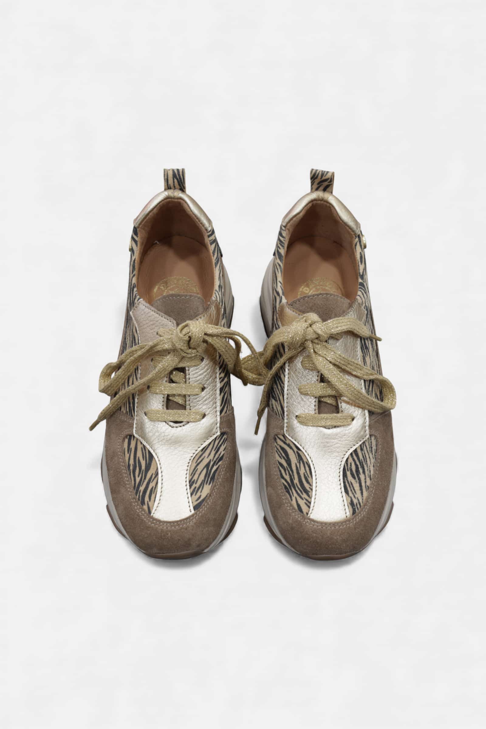 Estes magníficos e modernos desportivos de mulher, em pele e camurça, com fantasia animal print, em tons neutros, que combinam com os mais variados estilos, são fabricados em PORTUGAL.
