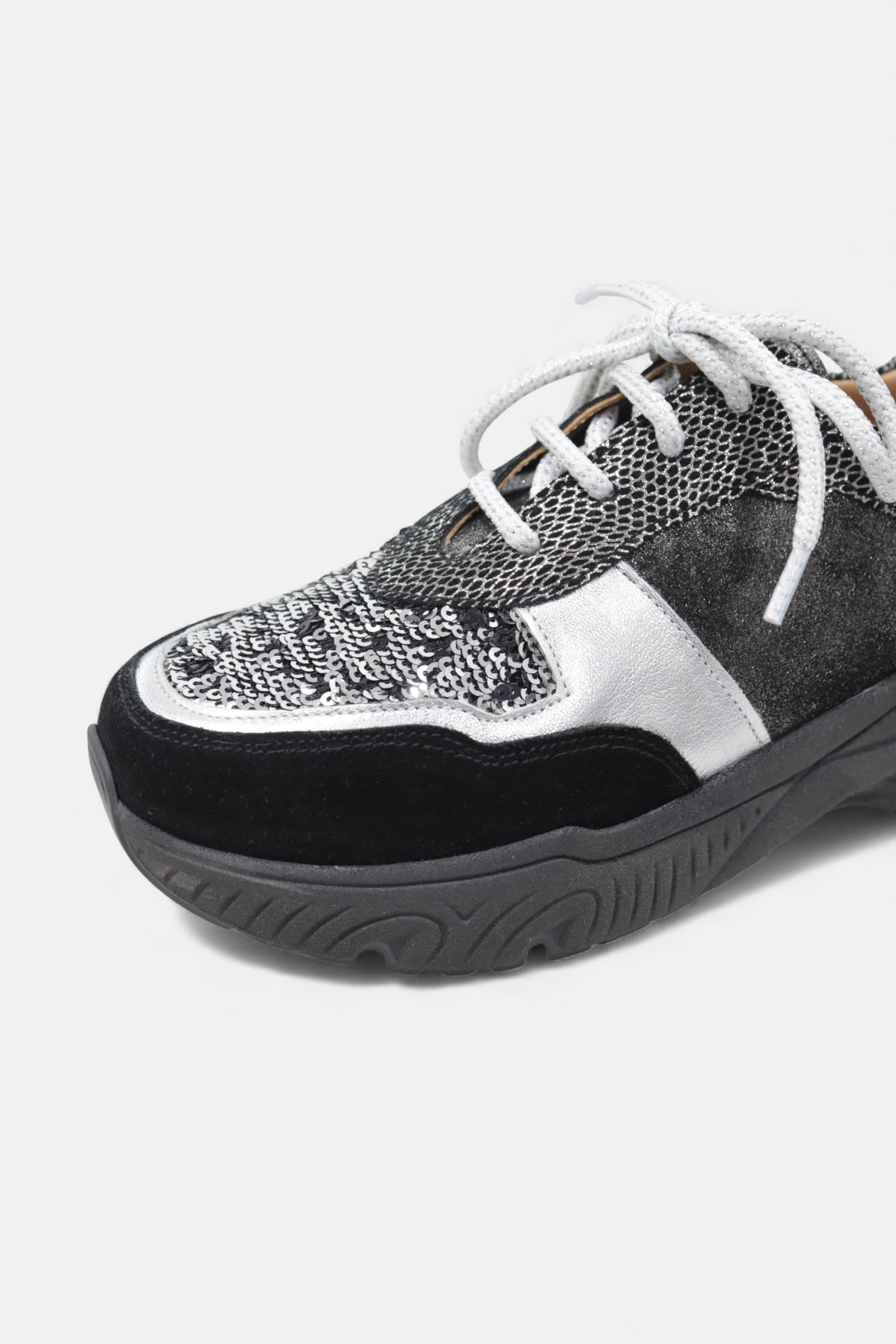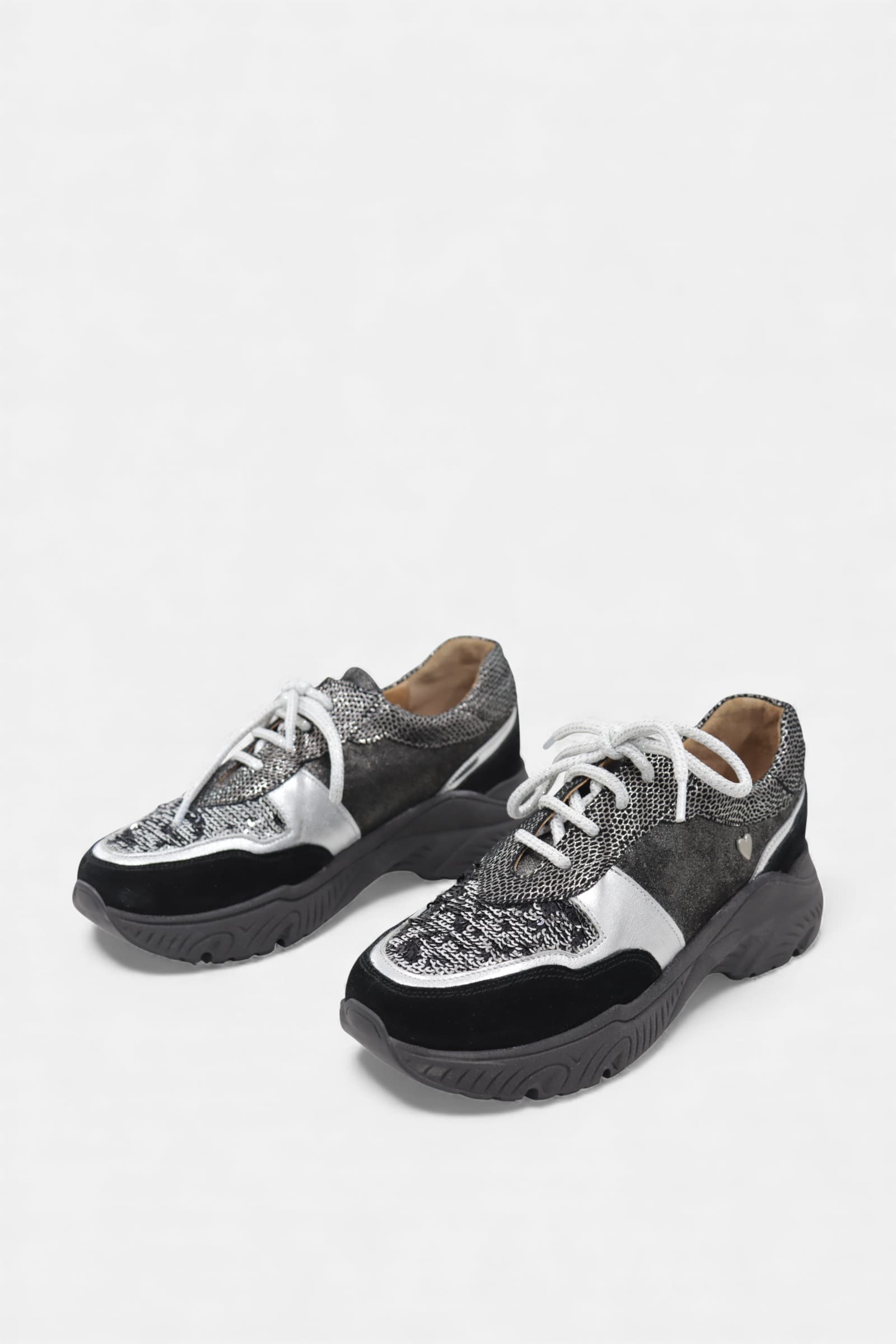 Estes magníficos e modernos desportivos de mulher, em pele e camurça, com fantasias brilhantes e lantejoulas em tons prata, que combinam com os mais variados estilos, são fabricados em PORTUGAL.